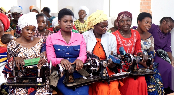 Des machines à coudre pimpantes neuves et leurs accessoires constituées des boitiers de canettes , mettre rubans, tournevis remises aux femmes autochtones et Bantu de Cibunga , Buyungule , Kamakombe, Kakenge, Businde , Kashanja, Kaboneke, Cibinda 1 et 2, Miti , Ikambi, Mululi, Muyange et Chombo.